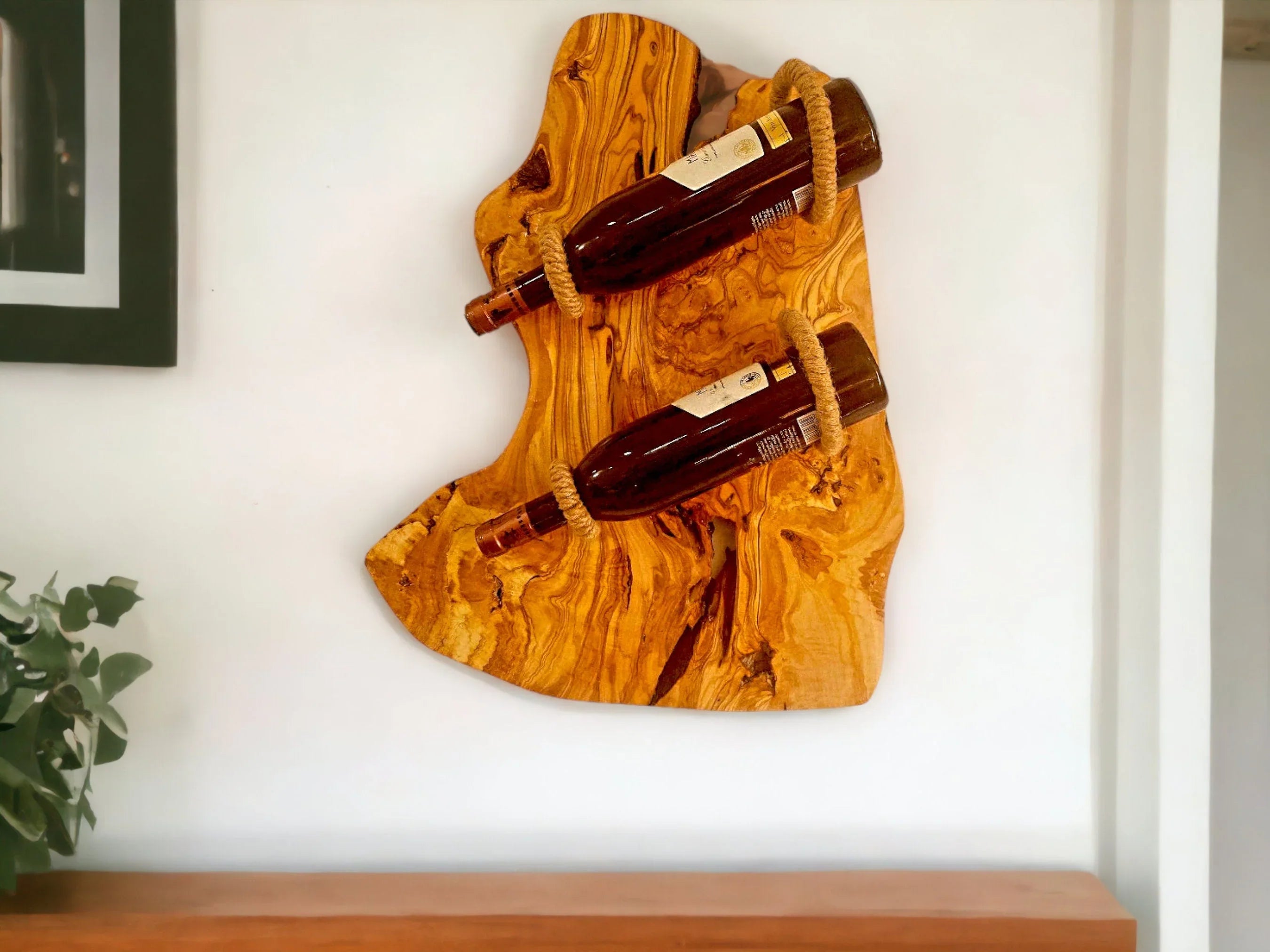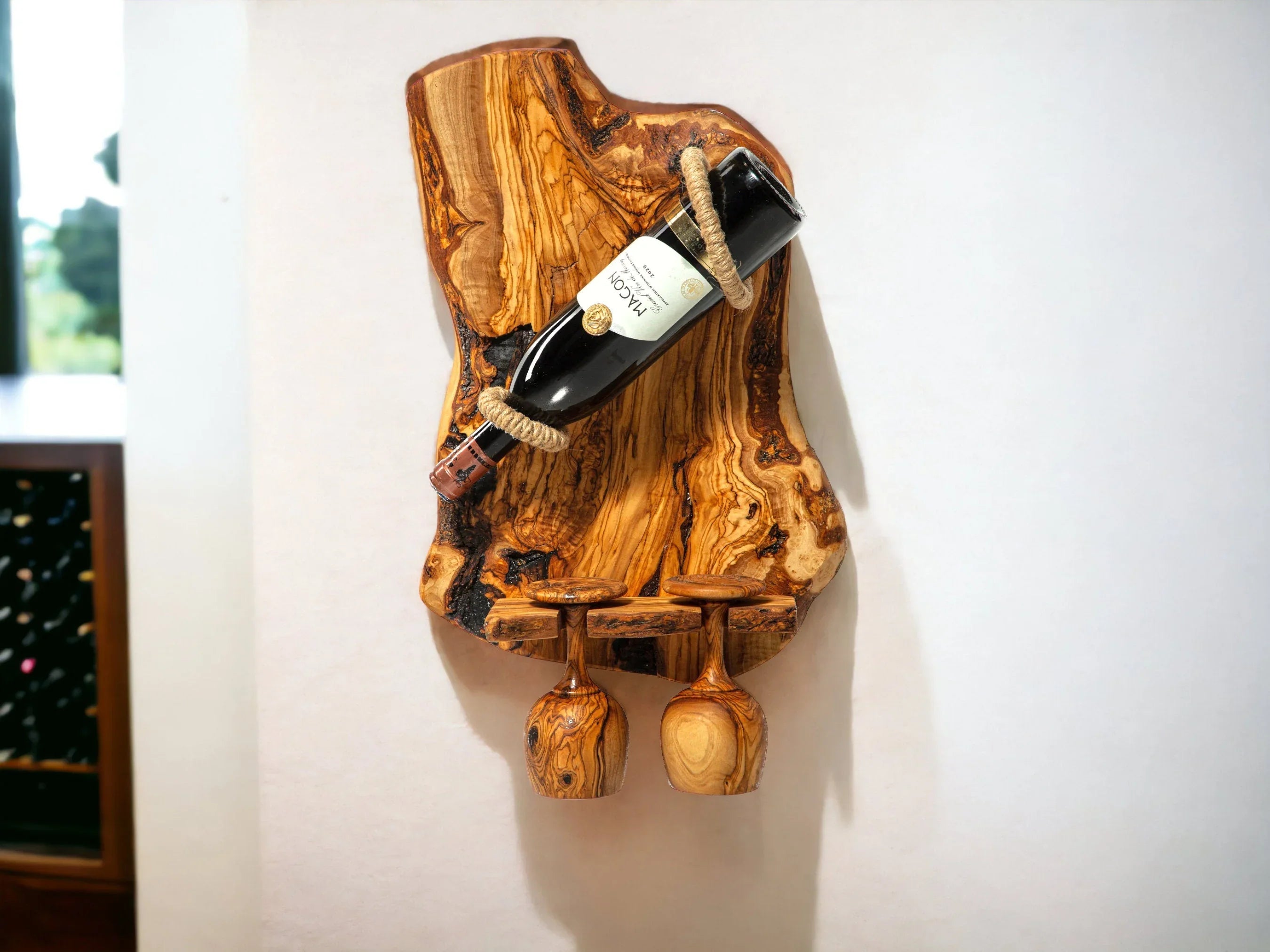 Olive Wood Wall Mounted Rustic Bottle Holder – A Toast to Artisanal Elegance