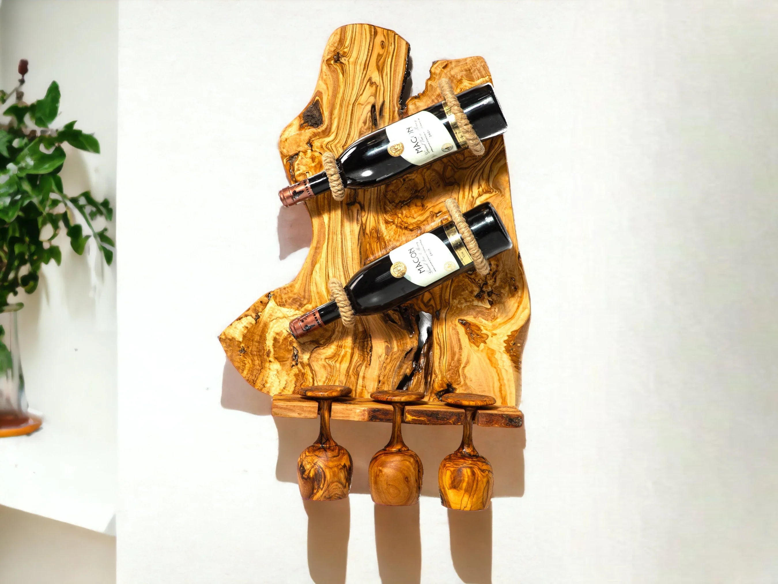 This exquisite Wooden Bottle Holder is handcrafted from premium sustainably sourced Tunisian olive wood, showcasing a striking natural grain that turns every piece into a rustic statement. Mounted on the wall, it functions as a wine bottle holder with a special twist — it comes with two beautifully carved olive wood goblets hanging beneath the display panel.